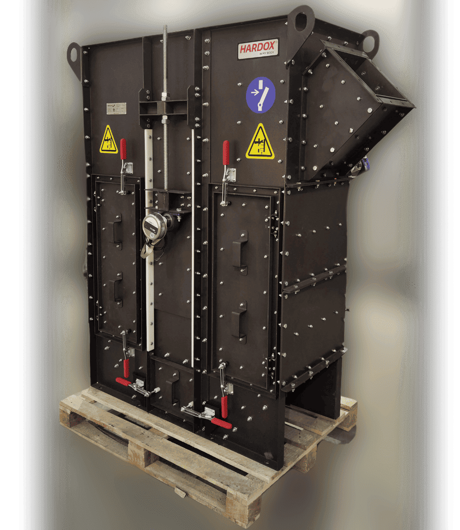 - The most heavily loaded components are lined with wear-resistant Hardox 450 steel, 5 mm thick.